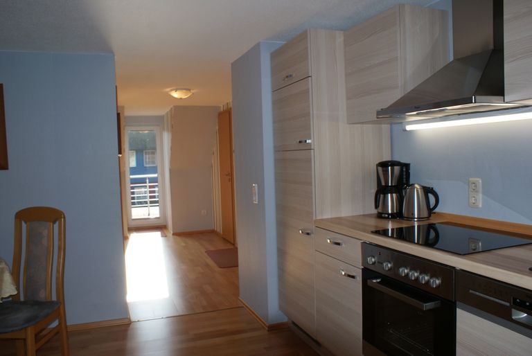 Die Einbauküche lässt kaum Wünsche offen. Cerankochfeld, Backröhre, Geschirrspüler, Kühl-Gefrierkombination, Eierkocher, Toaster, Wasserkocher, Kaffemaschine, reichlich Geschirr sowie Wein- und Sektgläser gehören dazu.